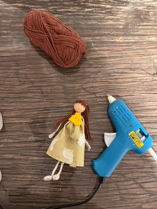 Cut several strands of brown yarn. Use the hot glue gun to glue them to the head to form the hair.