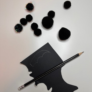 Dessine puis découpe deux ailes de chauve-souris dans le papier cartonné noir. Découpe également deux petits triangles (qui deviendront les oreilles)