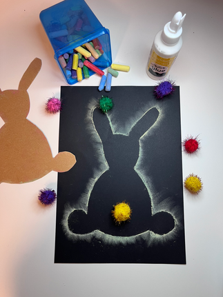 Grâce à un pochoir créer en carton et un peu de craie, les enfants peuvent créer un lapin de Pâques mystérieux, comme s’il venait tout juste de passer.